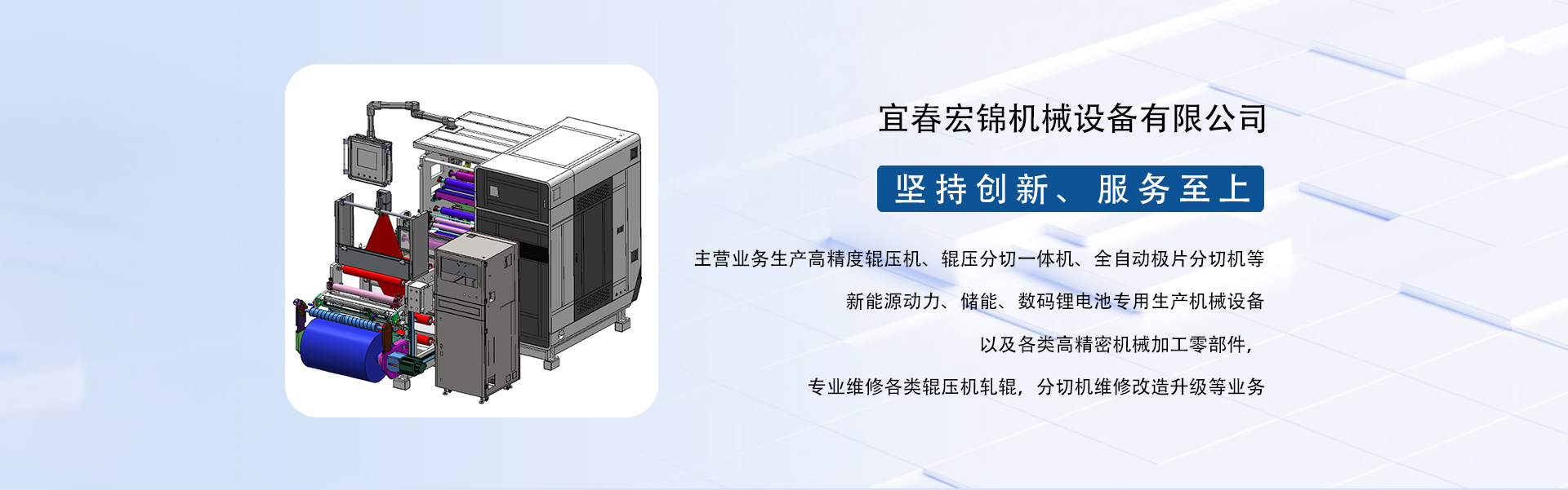 東莞市宏錦機(jī)械科技有限公司江西分公司是一家集研發(fā)、生產(chǎn)、銷(xiāo)售、服務(wù)于一體的創(chuàng)新型鋰電自動(dòng)化精密機(jī)械設(shè)備專(zhuān)業(yè)制造、服務(wù)商,坐落于江西省新余市渝水區(qū)新余經(jīng)濟(jì)開(kāi)發(fā)區(qū)孵化園5號(hào)廠房,廠房面積近6000平米,由東莞市宏錦機(jī)械科技有限公司于2024年11月投資新建,交通區(qū)位優(yōu)勢(shì)明顯、產(chǎn)業(yè)配套便捷集中,擁有一批具有行業(yè)豐富經(jīng)驗(yàn)的技術(shù)人員和管理團(tuán)隊(duì)。公司主營(yíng)業(yè)務(wù)生產(chǎn)高精度輥壓機(jī)、輥壓分切一體機(jī)、全自動(dòng)極片分切機(jī)等新能源動(dòng)力、儲(chǔ)能、數(shù)碼鋰電池專(zhuān)用生產(chǎn)機(jī)械設(shè)備以及各類(lèi)高精密機(jī)械加工零部件,專(zhuān)業(yè)維修各類(lèi)輥壓機(jī)軋輥,分切機(jī)維修改造升級(jí)等業(yè)務(wù)。根據(jù)公司發(fā)展三步走戰(zhàn)略規(guī)劃經(jīng)營(yíng)現(xiàn)下設(shè)三個(gè)二級(jí)獨(dú)立運(yùn)營(yíng)事業(yè)部分別為分切事業(yè)部(分切機(jī)、輥壓分切一體機(jī))、磨輥事業(yè)部(輥壓機(jī)、軋輥修磨)、機(jī)加事業(yè)部(精密機(jī)械部件加工)。經(jīng)過(guò)十余年沉淀發(fā)展主要客戶有新余贛鋒、南昌維科、宜春清陶、云南路華、河南恒一、江西程疆、四川天萊、蕪湖天弋、惠州億緯鋰能、無(wú)錫盤(pán)古新能源、鄭州比克、安徽鋰天下、臺(tái)灣長(zhǎng)利(宏基集團(tuán))、重慶維都利(紫建電子)、贛州諾威、安徽利維能、漳州萬(wàn)寶、重慶佳寶成、廣西皇冠儲(chǔ)能等一批具有行業(yè)知名度和影響力的企業(yè)。公司在新能源發(fā)展的道路上堅(jiān)持創(chuàng)新,為客戶帶來(lái)穩(wěn)定、高效的自動(dòng)化專(zhuān)用設(shè)備和更大的收益。